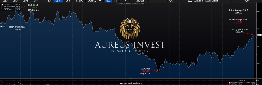After amaizing rally in December 2017, gold opened 2018 at 1302.90. As buyers continue tu push price furder, gold reached the high price of the year 1358.46 in early 2018 at January 24. That level becomes the strong resistance which buyers couldn’t break for weeks, after which sellers took over the precious metal in middle April. Until middle August gold